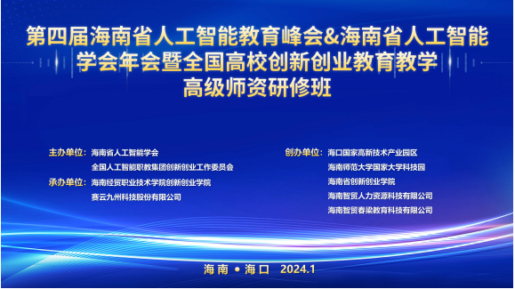 2024年人工智能教育峰会论坛暨学会年会暨全国高校创新创业教育教学高级师资研修班2024/01本次会议由海南省教育厅、海南省工业和信息化厅、海南省科学技术 协会、海南省科技厅、海南省教育培训研究院、海口市科工信局指导,由 海南省人工智能学会主办,海南省人工智能学会人工智能教育专委会、全 国人工智能职教集团创新创业工作委员会、中国电信股份有限公司海南 分公司、赛云九洲科技股份有限公司联合承办!本次会议探讨从产业实际 出发实现人才培养体系、模式、方法的转型升级,推进落实开创新时代教 育工作新局面 -